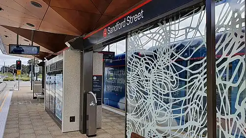 Sandford Street is a light rail station in Australia on the Canberra Metro R1 Civic to Gungahlin line, located at the intersection of Flemington Road, Sandford Street and Morriset Road in Mitchell. The station serves the surrounding business and industrial precinct, and will support future residential development in the neighbouring suburb of Kenny.[1] Bicycle racks are provided around the intersection adjacent to the station.[2] It is the only station on the Civic to Gungahlin route that did not open with stage 1 of the network.