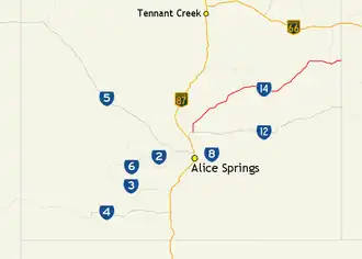 1. ^ "NT Map - All Roads" (PDF). Northern Territory Government. Archived from the original (PDF) on 5 May 2013. Retrieved 14 March 2020. National highways, primary roads & secondary roads