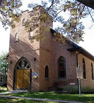 Following fund-raising efforts, the church was constructed in 1851 on a 0.5-hectare (1.2-acre) patch of land granted by Queen Victoria for the purposes of constructing a church and a graveyard.[7] The labour force consisted of the able-bodied members of the community; many of them made bricks from the Detroit River's clay by hand, while wealthier community members bought bricks from the Robinette Brickyard.[2]: 9 Trees from the area were also used as building materials.[6][7] Though the cornerstone was laid in 1851, the building remained unfinished as of 1852, and church members had to solicit donations to complete its construction.[4]: 65–66