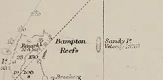 The whaling ship Velocity reported the fictitious island in the year 1876, as was noted on various late-19th-century maps, including an 1881 German map and 1895 British Admiralty chart.[4][7][8] After returning from a voyage in the Pacific, the Velocity's master reported two unusual features. The first was a series of "heavy breakers", the second some "Sandy Islets", or Sandy Island. Both then appeared in an Australian maritime directory for 1879. It noted the islets extended north and south "along the meridian 159° 57' E" and "between lat 19° 7' S and 19° 20' S".[9] Until the appearance of "Sandy I." in 1876–79, the nearest charted land or reef was the Chesterfield Islands 100 kilometres (55 nautical miles) westwards on the Bellona Plateau. At the time when the chart was created, it was standard practice for all potential navigation hazards to be listed on such charts as a precaution.