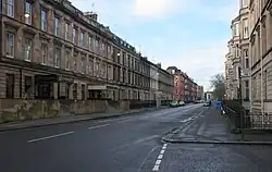 The area was a country estate outside Glasgow and north of the former burgh of Anderston[2] centred around Sandyford House until the mid-19th century,[3][4] when the expansion and industrialisation of the rapidly growing city spread westwards, with Sauchiehall Street, on which Sandyford House stood,[5] becoming one of the primary thoroughfares (at that time the western end of Sauchiehall Street was known as Sandyford Street, its name changing in the early 1900s).[6] A street plan was laid out and filled mostly with Neo-Georgian terraced townhouses[7][8] in a continuation of development which had taken place further east at Blythswood Hill,[9] the mansion itself being demolished by 1850. The Park district to the north was laid out in a similar period and in a similar style. To the east, as traffic to and from the city increased, a major road junction developed at Charing Cross.