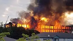 In 2017, the largest mill fire Sanford firefighters have ever battled erupted on Friday, June 23. The flaming five-story back building of the former Stenton Trust Mill complex at 13 River Street drew more than 100 firefighters from 20 communities to battle the blaze. The 294,000-square-foot complex, which was built in 1922 as a textile mill, includes two five-story brick and concrete buildings and a one-story connecting structure. Three boys from Sanford, two 13-year-olds and a 12-year-old, were charged two days later with felony arson in connection with the massive fire. Later, two of the boys pleaded guilty to counts of criminal mischief. The mills' demolition began in September, 2018 with the city working with the EPA to ensure all hazardous materials were removed.