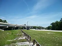 The bottom of the embankment for the C.A. "Bill" Benedict Bridge along US 17/92 in Sanford, Florida, along the former US 17/92 which once crossed the Lake Monroe Bridge until 1994, and is now part of the Lake Monroe Wayside Park. Within the image, the newer bridge rise above the old one, whose entrance is obstructed by palm trees.