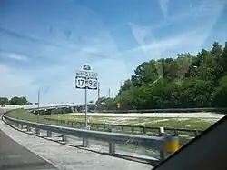 Northbound US 17 and Eastbound US 92 at the entrance to the Lake Monroe Wayside Park near Seminole, Florida. The wayside park originally was part of US 17-92 and lead to the old Lake Monroe Bridge. The entrance to the park is across from the intersection of the westbound exit and entrance ramps of Exit 104 on Interstate 4.