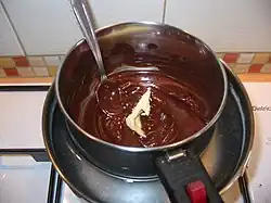 Sanguinaccio dolce ('sweet blood pudding' in English) is an Italian sweet cream based on bitter dark chocolate and pig blood, recognized as a prodotto agroalimentare tradizionale (PAT) in several Italian regions.[1][2][3][4] There are local variations in the degree to which it is served warm and runny for dipping or allowed to set and formed into a pudding or cake.[5] In Naples, it is traditionally prepared for Carnival.[6] However, public sale of pig blood was banned for health reasons in 1992.[7]