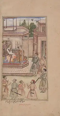 ![]() The blind king Dhritarashtra listens as the visionary narrator Sanjaya relates the events of the battle between the Kaurava and the Pandava clans. | |