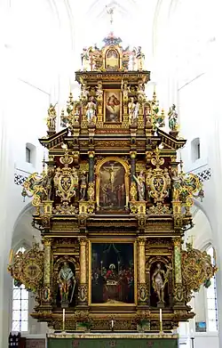 The altarpiece in St. Peter's Church is the largest wooden one in northern Europe.[16] It is made of oak wood and reaches a height of 15 metres (49 ft). It was made in 1611 by several local master carpenters: Jacob Kremberg, Statius Otto, Curt Snedker, Öllrich Svarfer and Henrik Könnicke together with Didrik Moll, a court painter in the service of Christian IV of Denmark, and the painter Pieter Hartman, a local resident. The altarpiece consists of four storeys or levels, one above the other. In the lowermost part there is a depiction of the Last Supper in the centre, and on each side wooden sculptures of Moses and John the Baptist, respectively. Above this there is a depiction of the Crucifixion, and above this there is a representation of the ascension. At the very top is the name of God, Yahweh, displayed.[1][22]