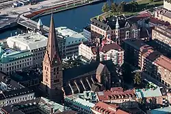 St. Peter's Church is Malmö's oldest church, oldest preserved building and originally the only parish church.[1][2][3] It is characteristic for the younger medieval cities of Scania, such as Malmö, to only have one original parish church; nearby Lund, an older settlement, in contrast had a high concentration of churches early on. The explanation is probably that Malmö rose to significance at a time when the land was already subdivided into parishes following the Christianization of Scandinavia in the preceding centuries.[4] Malmö began a rapid expansion thanks to the lucrative trade in herring around 1200 and the city was part of the economic infrastructure around the Hanseatic League and the Scania Market.[1] By the end of the Middle Ages the city had established itself as the most important commercial city in the province.[5] St. Peter's Church has been described as "the main Gothic monument within church architecture in Scania"[5] and as a "very good and strongly authentic representative of Baltic Brick Gothic".[6][1] During the 14th century, St. Peter's Church was the largest town church in Denmark.[note 1][7][6] It is part of an urban structure with a still largely intact medieval street layout.[6]