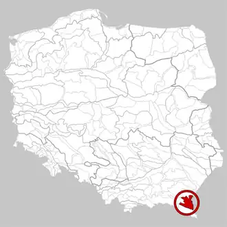 The Sanok-Turka mountain range stretches on an area of 930 km2 to the north of the Bieszczady Mountains, and to the south of the Przemyskie Upland, between the valleys of the middle San and Stryi River. They extend after the river Stryi by the Beskidy Brzeżne. The northern boundary is made by the rivers Wiar, Łomna, Stupnica, Leszczawka, Lachawka and Tyrawski, the western valley of the river San.[1] Sometimes the territories to the East and South of the river Wiar, (like the Sucha Obycz Massif), and the east of the Lachawka river valley to the valley of the river San (Wysokiego mountain range) are added to Sanocko-Turczańskie mountains (there are also different variations of the northern border). The southern border is generally carried through the ridges of the Otryt mountain range and through the San where the Tyrawski river joins as a tributary, although sometimes the Otryt mountain range is linked with the Sanocko-Turczańskie mountains, then the southern border is the Upper San river.[2]