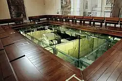 Excavations starting in 1979 showed that the church was built above the ancient Greek (4th c. BC) double curtain city walls, now visible in the transept of the church, with interconnected braces and continuing outside in Largo Sant'Aniello. 3rd century BC reinforcements to the walls are in the nave.