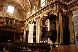 The church contains frescoes by Genovese and his brother Giovanni Battista Carlone; a fresco cycle on the Life of the Virgin by Giulio Cesare Procaccini (1574-1625), a “Nativity” and “Adoration of the Magi” by Pier Francesco Mazzucchelli, and frescoes by Guglielmo Caccia, depicting scenes from the Old Testament.[2]