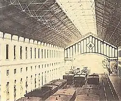 The actual project to construct the station at Cais dos Soldados was approved by the government on 8 March 1854.[3] The plan presented a station that included distinctive elements for commercial and passenger traffic, repair workshops, warehouses and services. For the passenger terminal, the government acquired the old Convent of Santa Apolónia, but the former army arsenal in the location was demolished to make way for the final design. From the beginning, the rail line and the commercial wharf required that land be reclaimed along the Tagus River.[4]