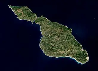 Santa Catalina Island (Spanish: Isla Santa Catalina; Tongva: Pimu)[1] often shortened to Catalina Island or Catalina, is a rocky island, part of the Channel Islands, off the coast of Southern California in the Gulf of Santa Catalina. The island covers an area of about 75 square miles (194 square kilometers). It features a diverse and rugged landscape, including rolling hills, canyons, coastal cliffs, and sandy beaches. The island's highest peak is Mount Orizaba, rising to an elevation of 2,097 feet (639 meters). The island is 22 mi (35 km) long and 8 mi (13 km) across at its largest width. The island is situated in the Pacific Ocean, approximately 29 mi (47 km) south-southwest of Long Beach, California. Politically, Catalina Island is part of Los Angeles County in District 4. Most of the island's land is unincorporated and is thus governed by the county.