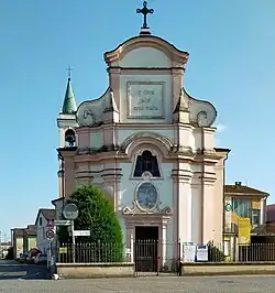The present church was erected at the site of an older Franciscan church that had an adjacent monastery. In 1716, after many previous tries, the community of Villa Arzenago (former name of Boretto) obtained permission from Rinaldo III of Modena to erect a church dedicated to the adoration of the True Cross. It is said the church has relics of the true cross. The vertical sweep of the facade is striking and the interior has a restrained late-baroque decoration.[1]