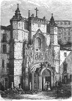 Afonso Henriques sought the influential support of the Augustinian canons, such as Dom Telo, Dom Teotónio of Bragança and Dom João Peculiar, who from the Romanesque Monastery of Santa Cruz, contributed to the transformation of the city into an important cultural nucleus of the kingdom.[2] Constructed in an area outside the gates of the old city, from 1131, the old monastery was built in the area called Banhos Régios (Portuguese: royal baths).[2] The monastery, later, had an important influence on the diplomatic battle between Afonso Henriques, the Kingdom of Castile and León and the Holy See for the recognition of Kingdom.[2] The delimitation of the historical parochia of Santa Cruz actually occurred before the recognition of the Kingdom, around 1137-1139. The masters of the monastery, such as Fernando Martins de Bulhão (later Anthony of Padua), helped motivate the cultural development of the nation's nobility, profoundly reformulated during the reign of Manuel I.[2]