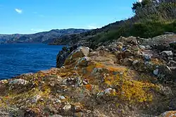 The island's coastline has steep cliffs, large sea caves, coves, and sandy beaches. The highest point is Devils Peak, at 2,429 feet (740 m).[1] A central valley splits the island along the Santa Cruz Island Fault, with volcanic rock on the north and older sedimentary rock on the south. This volcanic rock was heavily fractured during an uplift phase that formed the island, and over a hundred large sea caves have been carved into the resulting faults. The largest is Painted Cave, among the world's largest.[5]