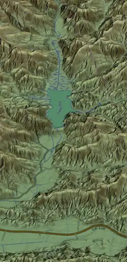 The elevation of the reservoir is 1,043 ft (318 m), and the elevation of the dam spillway is 1,055 ft (322 m).[1] The dam is owned and operated by the United Water Conservation District based in nearby Santa Paula, California.[2][3] The district is a multi-service district providing flood control, recreation services, surface, and groundwater conservation, groundwater replenishment, and wholesale water for agriculture and urban uses to the Santa Clara River Valley and Oxnard Plain. Formed on December 5, 1950, under the Water Conservation Act of 1931,[4] it owns approximately 2,200-acre around and including the lake and dam (890 ha).[5]