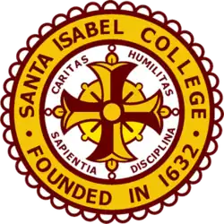 The Cross at the center of Santa Isabel College's seal symbolizes Christ, the Center, whose charity urges the institution in its mission of educating the youth. The even arms of the cross stand for the school's freedom from bias in the choice of her students. In between the arms are inscribed four Latin terms, namely: Caritas-Charity, Humilitas-Humility, Sapientia-Knowledge, and Disciplina-Discipline. The school instills in the young, benevolent love, humility, and self-control in relation to themselves, their peers, and specially the less-privileged. The students are given equal opportunities to acquire and interpret knowledge of truth about the realities around and most especially, the reality of God's providence to human beings, through the different programs. These four aspects of the seal are integrated in the context of the student's Christian and human development.