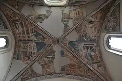In the end of the nave, left of the 17th century main altar is the Chapel of the Crucifix (Cappella del Crocifisso), that had 15th-century frescoes depicting Life of San Ladislao and commissioned by King Ladislaus of Naples in 1403. Fragments are now displayed in the main nave, and attributed to an unknown master. The ceiling of the chapel has frescoes on the subject of Life of the Virgin, and the chapel once had a polyptych, now in the Museum of Capodimonte, both of these were by the same artist.