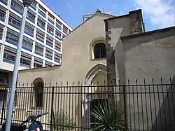 The particular shape, consisting of two asymmetric naves, derives from the fact that part of this church was once a tribunal during the Angevin Era. The church floor is lower than the street level, since this area was raised using soil from the nearby earthenworks of the Castel Nuovo in times of Charles V. Fragments of frescoes dating likely from 1352 are visible in the first bay to the left of the entrance, they once depicted the Triumph of Faith and Seven Sacraments, attributed to Roberto d'Oderisio. Some attributions, without any documentation, have been made for some of the images on the frescoes; they remain highly speculative.