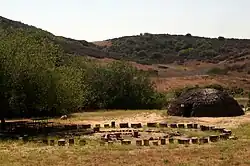 At least 73 archeological sites, structures, cultural landscapes, and cultural properties in the SMMNRA are eligible for listing on the National Register of Historic Places.[50] The SMMNRA also contains 26 known Chumash pictograph sites[51] and a number of California Historical Landmarks lie within the area, including the site of the Port of Los Angeles Long Wharf (#881), Point Dume (#965), and Adamson House (#966). Also within the SMMNRA is Paramount Ranch, however, the Woolsey Fire severely damaged the ranch in 2018.
