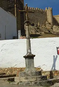 Opposite the doorway to the Iglesia de Nuestra Senora de la Asuncion, and a little down the hill, stands a 16th-century Plateresco style cross erected to mark the way of Pilgrimage known as the 'Silver Way'[7] or Vía de la Plata to Santiago de Compostela from the Andulucian city of Seville. The marker consists of a baluster column topped by a Genovese capital. Above the capital sits a Plateresque flint cross.