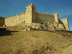 The castle stands on a prominent rocky ridge above the village. The fortress, although the ramparts are reminiscent of Moorish castles, was built by the Christian king of Castile, Sancho IV in the thirteenth century replacing a much smaller fortress which had been built earlier by the Muslim rulers of Andalucía. The Muslim structure is thought to have been built on top a much early Roman fortification. The castle was part of a defence system built to protect the city of Seville from the Portuguese. This defence system was called the Banda Gallega or The Galician Band. The system composed of three lines of defence, which mostly utilized older Moorish fortresses. The first line contained the castles of Aroche, Encinasola and Fregenal de la Sierra. In the second line was the Torre of San Bartolomé and Cortegana castle. The third line included Santa Olalla del Cala and the fortress at Aracena.