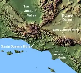 The community of Santa Susana is adjacent to the Santa Susana Pass wildlife corridor, which connects the Simi Hills (and the Santa Monica Mountains) to the Santa Susana Mountains and further wilderness areas such as the Tehachapi Mountains and San Gabriel Mountains.[52] It is home to an abundance of wildlife, including larger mammals such as numerous cougars, coyotes, bobcats, grey foxes and more common species such as the Virginia opossum, California raccoon, ring-tailed cat, California vole, desert cottontail, Botta's pocket gopher as well as the spotted- and striped skunk. Large undeveloped areas provide natural habitat to numerous species, and saves the wildlife of the Santa Monica Mountains from genetic isolation. As in the rest of the Simi Valley, large areas are assigned parks or open space preserves and are protected wildlife habitats. The dry semi-arid climate of Santa Susana also provides a habitat for numerous species adopted to arid climates and temperature extremes. It is home to numerous reptiles, including eleven species of snake: coachwhip, southern Pacific rattlesnake, San Diego night snake, striped racer, California black-headed snake, two-striped garter snake, San Diego gopher snake, coast mountain kingsnake, California kingsnake, coast patch-nosed snake and ringneck snake. Lizards found here are also plentiful, including the San Diego horned lizard, California horned lizard, San Diego alligator lizard, western fence lizard, California side blotched lizard, western skink, western whiptail, and silvery legless lizard. Birds in the area are mostly raptors, including the California vulture, turkey vulture, white-tailed kite, American kestrel, Cooper's hawk, sharp-shinned hawk, marsh hawk, red-tailed hawk, red-shouldered hawk, and the common nighthawk. Owl species include the great horned owl, short-eared owl, long-eared owl, barn owl, and the burrowing owl. There are also peacocks[46] and numerous other species of wildlife found in the eastern Simi Valley.[18] Scorpions are also common.