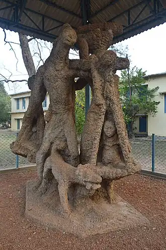 Santhal Family is a rough outdoor sculpture, made of cement and laterite gravel.[6] The sculpture shows a Santhal father, mother, their child and dog, carrying a couple of possessions with them.[7][8] Having left their home behind, the family, most likely migrant labourers, is in search of a new destination to settle and start afresh. The figures are earthy and embody humility.[4][9] Its subject and medium are in line with modernisation, globalization and industrialization, as they symbolise the dynamism and zeitgeist of traditional Bengal at the time of industrialization.[9][10]