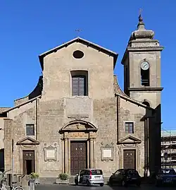 The church was nearly completely rebuilt in 1759, this time with an apsidal dome, with designs by Giuseppe Antolini. The facade now is partially plastered in between peperino stone pilasters. Further refurbishments were completed in 1901 and 1909. Between 1960 and 1962 a new marble floor and roof were added. The central portal has a rounded tympanum. On the southwest flank are wide buttresses. On the left of the central portal a marble plaque with a peperino stone frame from 1654 recalls the presence of the Order of the Knights of Rhodes. The remains of a sundial still remain visible on the left wall. The square belltower, with an onion dome, was added in 1594.