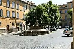 The neighborhood around this church began to populate in 1172 after the destruction of the town of Ferento; the neighborhood was only included within city walls by 1210. The fountain (Fontana di San Faustino) in front of the church was built circa 1252.[1] The church and the town's castle were granted in 1524 by the pope to the Hospitaller knights of Rhodes, recently evicted from the island by the Ottomans. The order of knights was housed in the Rocca Albornoz, located a block northeast of this church. The Grand Master Philippe Villiers de L'Isle-Adam chose the church dedicated to the martyr Faustino, for the religious functions of the Order. He brought to the church a venerated Byzantine icon of the Madonna of Constantinople. In 1527, the Knights parted from Viterbo to relocate to Malta, thus becoming Knights of Malta.