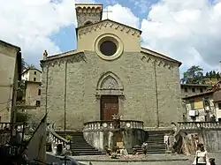 A church at the site dates from about the 11th century, but construction of the church continued until the 1300s. The scenographic, baroque entry stairs were built by Agostino Cornacchini. The main 13th-century portal, with a pointed tympanum above, was refurbished by Pietro Bernardini with flanking baroque-style corinthian pilasters. The bell-tower dates to the 13th-century.