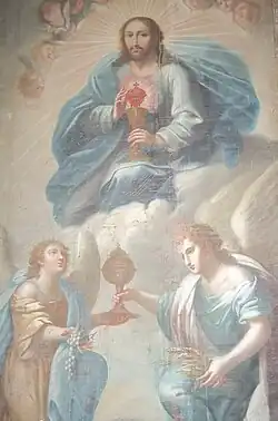 There are murals in the domes. In the sacristy dome is a depiction of La crucificción de Jesucristo (Jesus Christ's crucifixion); the dome symbolizes heaven, whence angels, cherubs and saints look on; the central image is Christ being taken down from the cross.