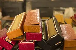 The raw materials used in making these goods are classified according to the grain quality and smoothness as E.I. Tanned leathers of sheepskin or goatskin that are dyed with vegetable colours. Three leather types are defined: "Paper" which has a coarse grain and spots is the skin of larger goats or sheep, and "Bind" and "Kid" which are both derived from smaller animals and are of superior quality. Other materials used to make the final product include paper board of varying thickness, cotton, velvet or silk for lining, foam rubber for padding, natural dyes and spirit, rubber solution, and assorted sundries.[1]
