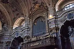 The second bay on the right contains the entrance portal and, above it, the organ, placed in a case decorated with festoons and capitals and made in 1785 by Giacomo Caniani and gilded in 1829 by Giovanni Mora.[31] The current instrument is a “Benzi e Franceschini” from 1909, restored by the company Inzoli Cav. Pacifico in 2006.[36] It has 27 pedals, two 57-key keyboards, 1,577 pipes.[36] It has the following sound configuration:[36]