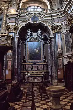 The altar, by an unknown artist, may have undergone several interventions over time; it is made of polychrome marble with a panel in the center depicting Jesus being taken down from the cross. A base supports two spiral columns, capitals and two tall pulvini with kneeling plaster cherubs; above the arch there is a motif with clouds, angel heads and the radiating triangle with an eye, symbol of God.[35] The altarpiece has a painting of the Nativity or Sacred Conversation, by Callisto Piazza, commissioned by the Consortium in 1537.[35]