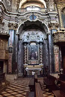 The altar, originally by Ambrogio Pedetti, was rearranged by Domenico Catella in 1820 and, perhaps, by Angelo Bacchetta in 1885. It is made of gray, black and white marble, with a roundel with a cross in the center. Above a high red marble base, it supports two volutes that continue into two marble lesenes that support a mixtilinear trabeation with a central conch; finally, two little angels in Carrara marble hold the veil of Veronica.[35] The altarpiece reproduces the Deposition of Jesus in the Sepulcher, a canvas by the Tuscan artist Pompeo Batoni from the 18th century.[35]