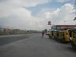 The main road in this barangay is Ninoy Aquino Avenue, a national secondary road which runs north–south connecting NAIA Road and Dr. Santos Avenue near the southern perimeter of Ninoy Aquino International Airport.[13] It is connected to the C-5 Road network via Multinational Avenue which runs along Ibayo Creek and to the South Luzon Expressway via Kaingin Road. This area in the southern edges of Santo Niño in close proximity to the main airport runway is home to several other freight and logistics businesses, as well as shanties along the creek which in 2010 was home to 150 informal settler families.[14] The main residential area is crossed by Col. De Leon Street in the west which runs parallel to and midway between Ninoy Aquino Avenue and the Estero de Tripa de Gallina. Its main east–west corridor is Pascor Drive in the north which traverses the area that formerly housed the 11-hectare (27-acre) PAGCOR Casino Filipino Airport complex which closed down in 2014 and which was bought by SM Prime Holdings in 2018.[15] In the south, the barangay is crossed by J.P. Rizal Street which links Ninoy Aquino Avenue to the bridge over the Tripa de Gallina to Don Galo. This street is home to the Santo Niño Parish Church and Santo Niño Barangay Hall, as well as the Ibayo Town Center. The C-5 South Link Expressway will run along its southern limits parallel to the existing C-5 Road.