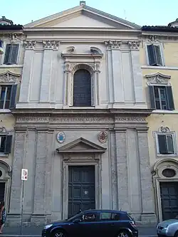 It is on the site of the medieval church San Salvatore in pensilis[1] de Sorraca,[2] built on the remains of the Circus Flaminius (and recorded in several documents between 1174 and 1209). An inscription now housed in the entrance of the Palazzo Busiri on via Aurora (all that remains of the medieval church) refers to this church's rebuilding being completed on 28 October 1285 "per venerabilem Hieronymum episcopum Prenestinum".
