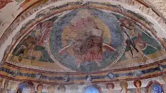 The actual building has a single nave three bays and an end apse. The sacristy was added to the apse during the Baroque period. The outside the apse is decorated with four lesene and twelve niches. Inside it preserves precious frescoes from the 11th century, featuring Christ and the four Evangelists, with 14 figures below representing the Apostles and saints.