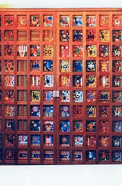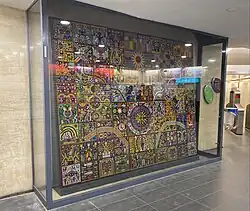 Pensamiento y alma Huichol was created in 1997 Palais Royal-Musée du Louvre station as part of the RATP Group - Mexico City Metro alliance. This is his most renowned and talked about work, which represents Huichol deities, ancestors, myths, flora and fauna on a horizontal tripctic of the underground, the earth and the sky. The work is composed by 80 boards and elaborated with two million beads of 2 millimeters each one. It is located at the Palais-Royal Musée du Louvre towards the Carrousel du Louvre. On this work, researcher Miguel Gleason comments on his book México insólito en Europa: “Its perhaps the most impressive and detailed work in Europe, composed by more of 2 million beads that shows the cosmogony of that community (Huichol people)".[3]