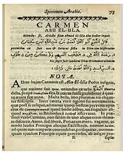 The Dutch Arabist Erpenius and his pupil Jacobus Golius collected manuscripts, and Golius purchased a copy of Dhou as-Saqt, now held in the collections of the University of Leiden.[19] He also published a few short extracts of al-Ma'arri's work in his 1656 edition of Erpinius' work on Arabic grammar.[5] The first publication of selections from Saqt az-Zand in a European scholarly work was in the collection Specimen Arabicum, a 1638 anthology of Arabic literature by Johann Fabricius published in Gdańsk.[20][21]