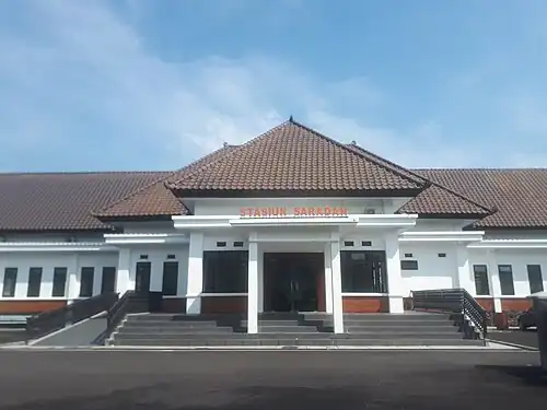 Saradan Station (station code: SRD) is a third-class railway station in Sugihwaras, Saradan, Madiun Regency, East Java, Indonesia, operated by Kereta Api Indonesia.[1] This railway station is at the most eastern railway station in Madiun Regency. This station's new building is operated—which has four tracks (two main lines and two passing tracks)—since Nganjuk–Babadan double track segment activation on 30 April 2019.[2]