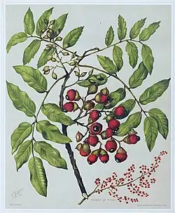 The album was the first full-colour art book to be published in New Zealand.[5] It contained systematic and popular descriptions of the native flowering plants of New Zealand and the adjacent islands, and included information about Māori uses of plants,[7][6] sourced by Edward from his friend William Colenso.[1] Featon created all of the artwork for the book and commissioned the chromolithography for the book plates from the workshop of Bock and Cousins, Wellington. Her treatment of each individual plant exemplified both her botanical expertise and skill as an artist, as she emphasized the plant's aesthetic qualities while clarifying its properties and scientific characteristics.[8] The album was originally published in three parts, the first part being released in November 1887 and the next two in 1888. The three parts were issued as a single volume in 1889.[3] The book was the first with fully-coloured art to be printed in New Zealand.[1]