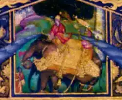 The background of the painting consists of a large arch reminiscent of a pishtaq. The spandrels of this arch contain swans.[6] A panel, on the cusp of the arch, depicts a rider atop an elephant. This is a reference to another Bijapur painting, which depicts Ibrahim riding his favourite elephant Atash Khan.[1]