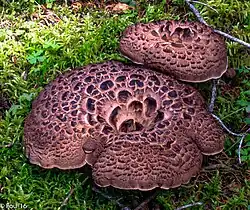 From above, it may be confused with Strobilomyces strobilaceus as both have a similar shaggy cap.[8] The bitter and inedible Sarcodon amarascens can be distinguished by its bluish-black stripe.[9] The bitter Hydnellum scabrosum (formerly placed in Sarcodon) has a turquoise-tinted base.[5][7]
