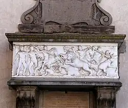 The original Sarcophagus of Bella Galiana is an Ancient Etruscan or more likely 3rd century[1] Roman marble sarcophagus on display inside the Museo Civico of the town of Viterbo, region of Lazio, Italy. The deep relief sculpture depicts a hunting scene, which was a popular decoration for such sarcophagi. The scene is described by some as a version of the myth of the hunt of the Calydonian boar. A marble copy of the sarcophagus replaced the Ancient Roman original, which had been displayed outside on the facade of the church of Sant'Agnelo in Spatha standing across from the Palazzo dei Priori, Viterbo. Somehow the story on the facade has been linked to a popular legend, predating the 15th-century, regarding the life and death of a beautiful young woman, the Bella Galiana (Beautiful Galliana), of Viterbo.