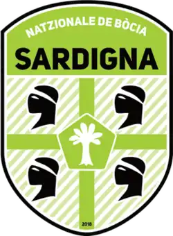 The emblem of the Natzionale is a rounded shield with different elements taken from the Sardinian culture. In the upper part, on a green background there is the lettering, in Sardinian language, "Natzionale Sarda de Bòcia". In the main part there are the classic Quattro mori' although with the Saint George's cross in green version instead of red. At the center of the cross then, set in a green pentagon extrapolated from the iconic standard of the soccer ball, a stylized eradicated tree, symbol of the Judicate of Arborea, the last entity representing the independent Sardinia and symbol that still characterizes the coats of arms in the most different variants of more than 80 municipalities of the island.[15]