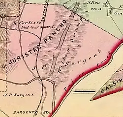 Before the Spanish colonizers arrived to settle Alta California in 1769, approximately 2,700 Mutsun Native Americans speakers inhabited villages along the Pajaro River. Today, most of the over 500 members of the Amah Mutsun band are descendants of the native people who were baptized at Mission San Juan Bautista.[3] Spanish explorers led by Juan Bautista de Anza and Pedro Font first passed through the Santa Clara Valley area in 1776, and in 1797 Mission San Juan Bautista was established near the Pajaro River.[4] In 1835, Antonio and Faustino German were granted, by Governor José Castro, the 4,540-acre (18.4 km2) Mexican land grant Rancho Juristac.[5] In 1856 James Pattee Sargent (1823–1890), a rancher and assemblyman, bought Rancho Juristac with his brothers, where he established his residence, later known as Sargent Ranch. The establishment of the Sargent Station in 1869 marked the beginning of the town's prominence. Located off Monterey Road next to Sargent Ranch, the station quickly became a stop on the Southern Pacific Railroad, facilitating the transport of goods and passengers and spurring economic growth in the surrounding area. Additionally, Sargent Hills and Sargent Creek are also located nearby to the west.[3][4][6] Sargent was frequently mentioned as the western boundary of the Soap Lake floodplain.[4]