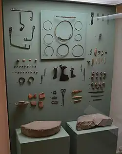 Major Varangian finds at Sarskoye date from ca. 800 onward, indicating that it was a major (perhaps the most important) trade station on the Volga trade route between Scandinavia and Baghdad. Traces of a bath, an iron foundry, a potter's workshop and a jeweller's shop were encountered. There were two hoards of early 9th-century dirhams. Another deposit was detected in the vicinity: it contained dirhams inscribed with Runic signs, interpreted as a thanksgiving to Thor.